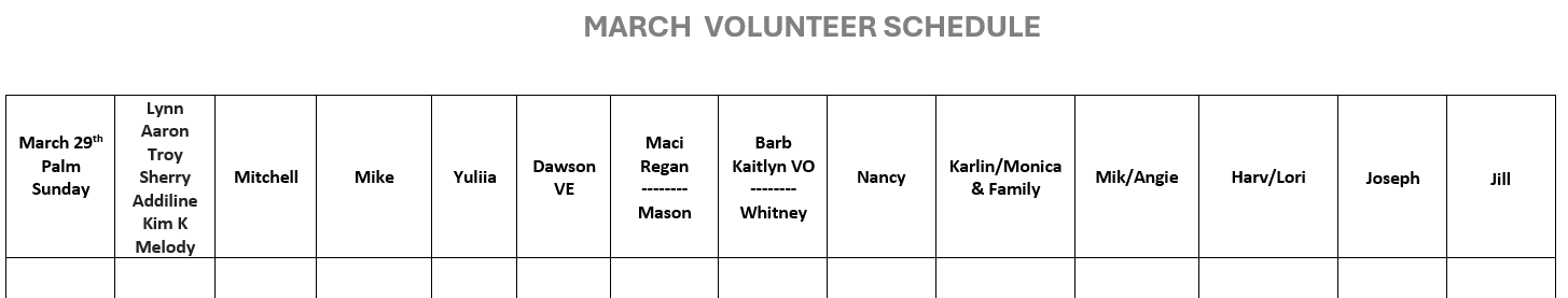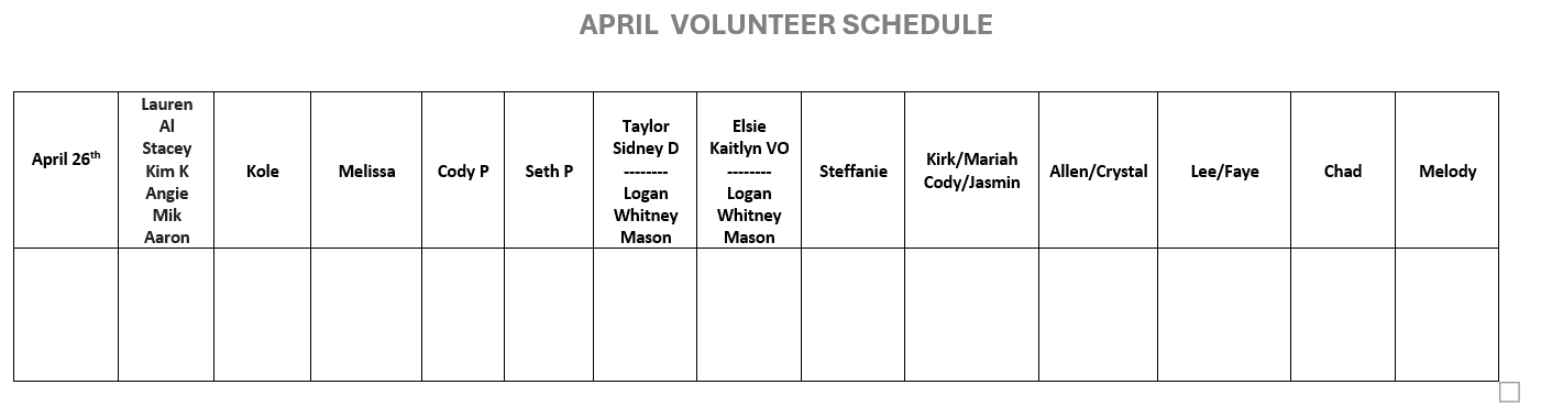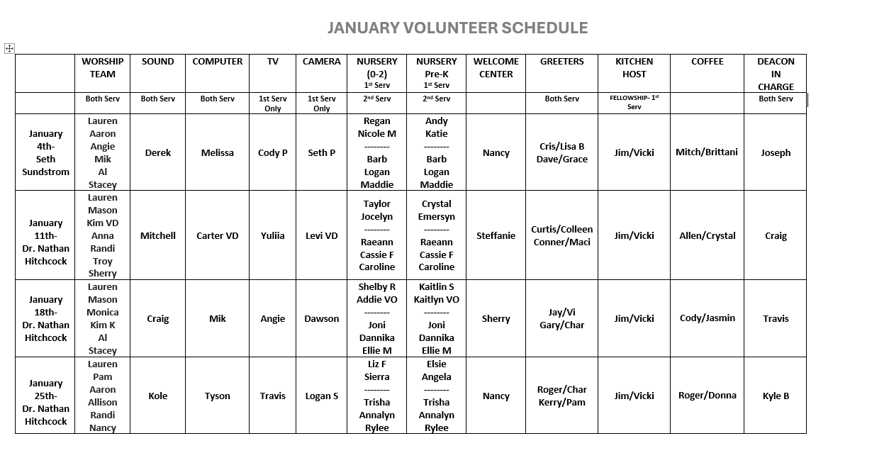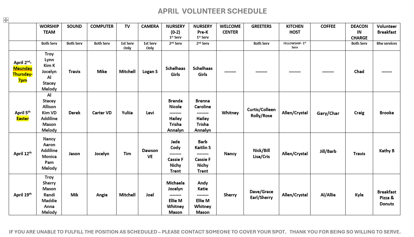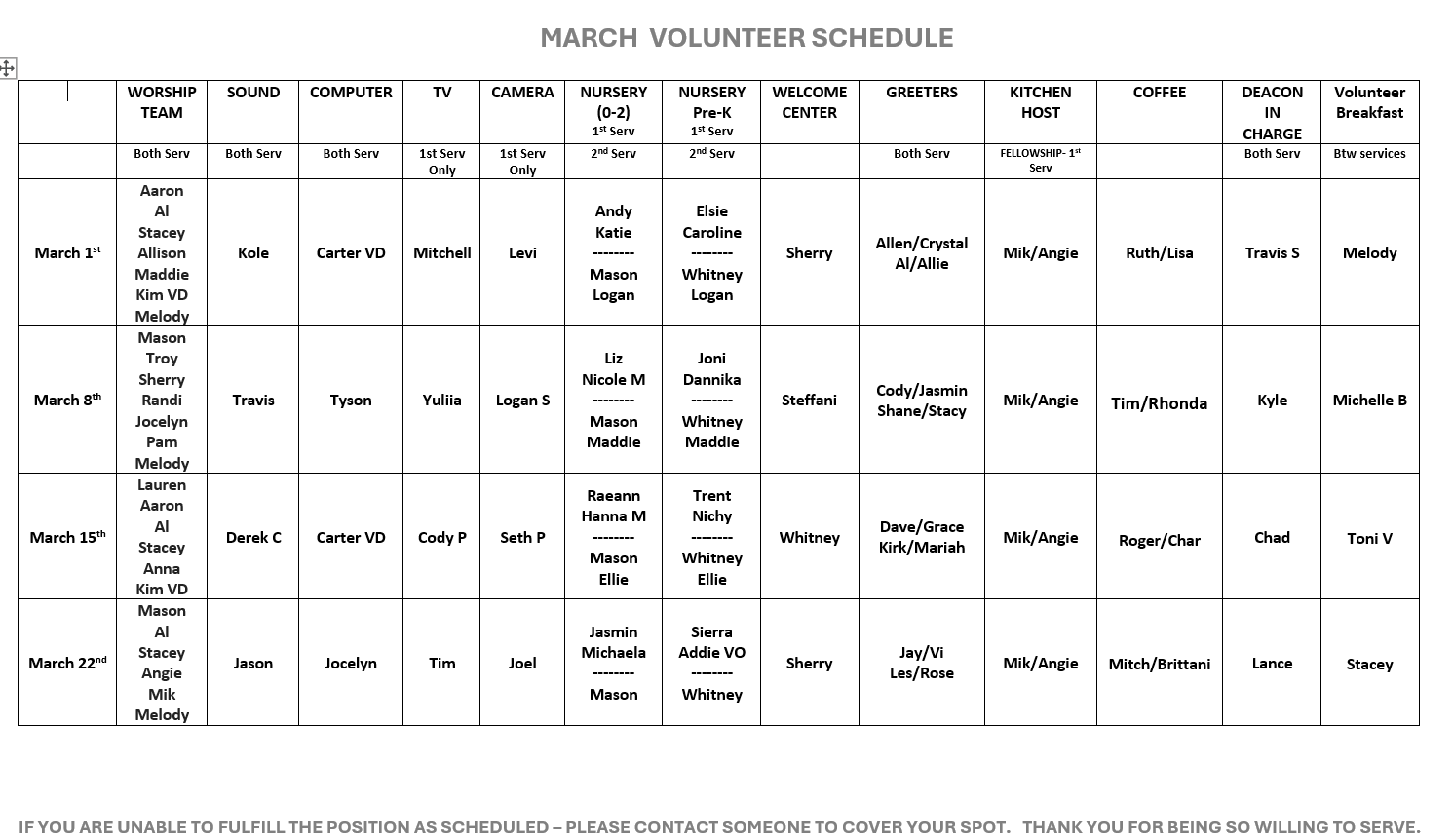 If you are unable to fulfill the position as scheduled - Please contact someone to cover your spot. Thank you for being so willing to serve.
